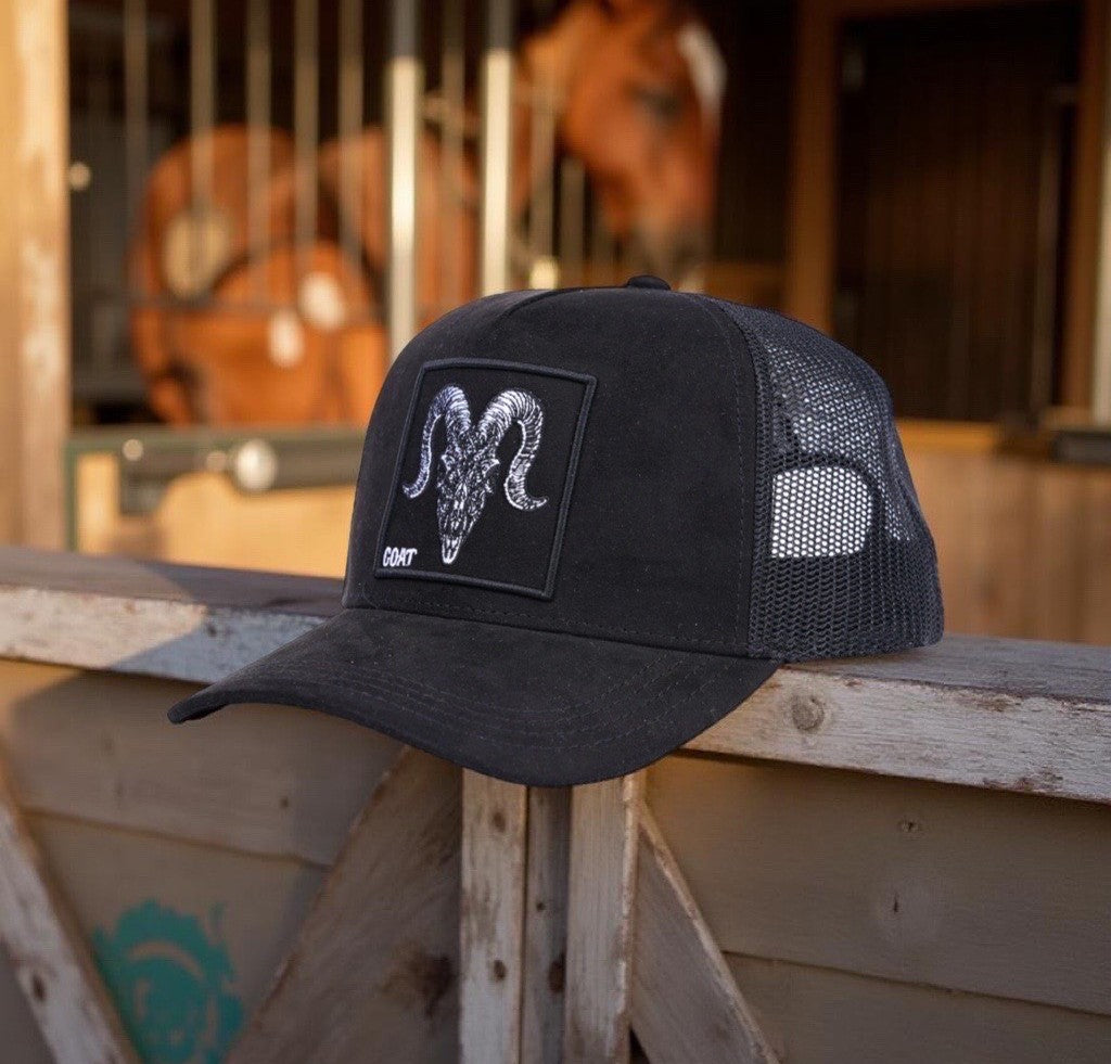 Experience a comfortable fit with the Skull Goat Trucker Hat. Our expertly crafted black suede adds a touch of style to any outfit. The unique skull goat design makes this hat a perfect addition to your collection.